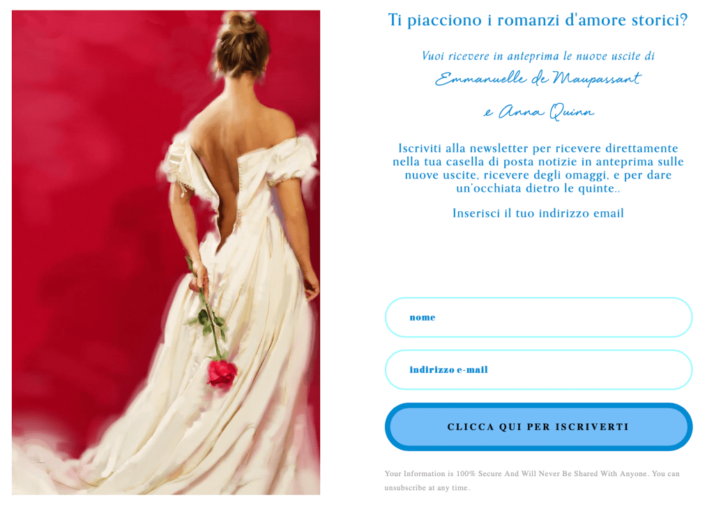 Ti piacciono i romanzi d’amore storici? Vuoi ricevere in anteprima le nuove uscite di Emmanuelle/Anna? clicca qui per iscriverti More Eyes are Welcome Share on Facebook (Opens in new window) Facebook Share on X (Opens in new window) X Share on Pinterest (Opens in new window) Pinterest Share on Tumblr (Opens in new window) Tumblr Share on WhatsApp (Opens in new window) WhatsApp Like Loading...