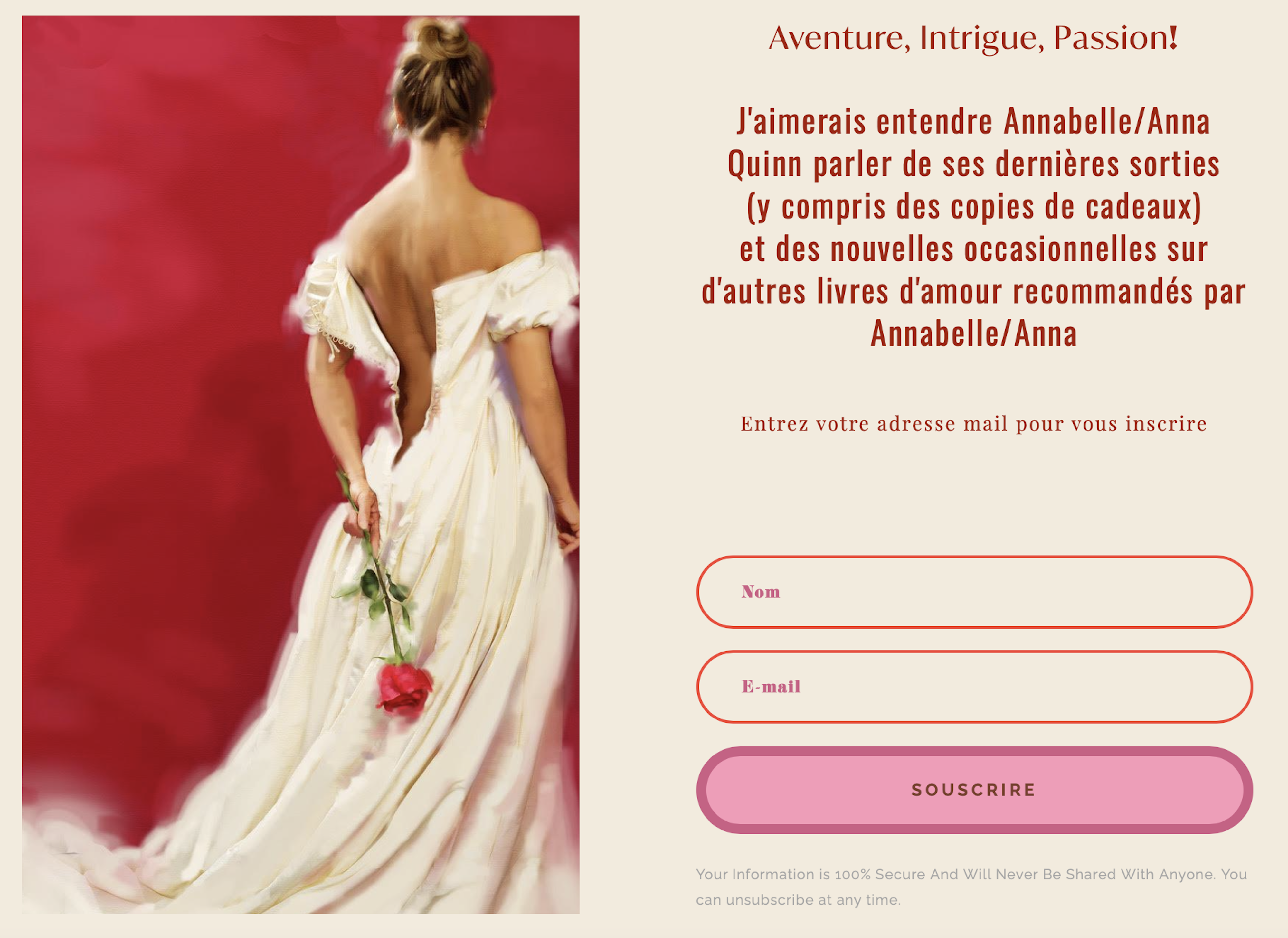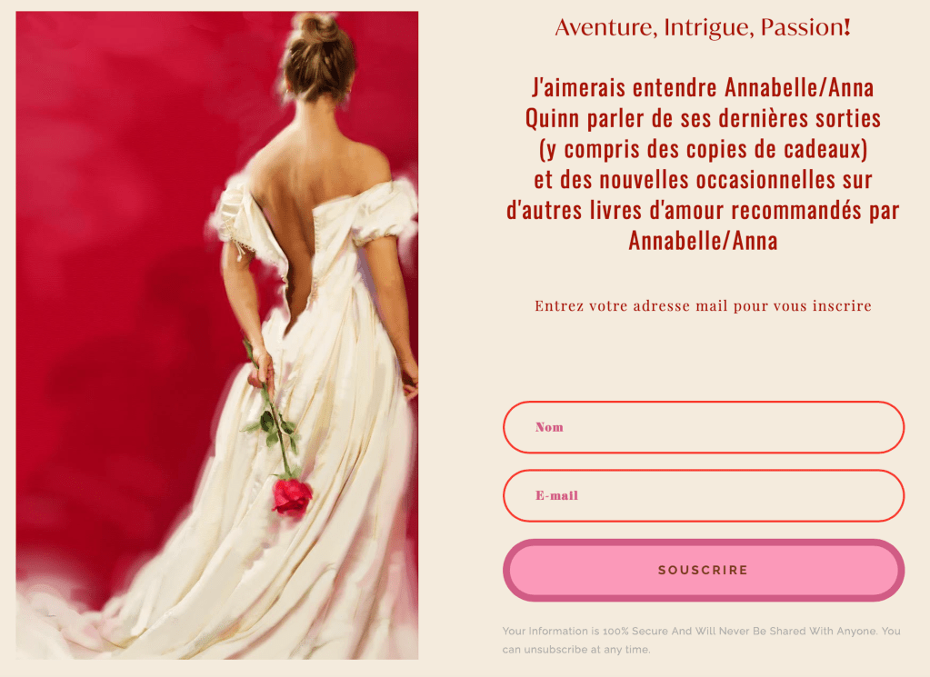 Vous aimez des romans d’amour en français? L’auteure publie (des romances historiques) sous trois noms de plume : Annabelle Quinn, Anna Quinn et Emmanuelle de Maupassant. More Eyes are Welcome Share on Facebook (Opens in new window) Facebook Share on X (Opens in new window) X Share on Pinterest (Opens in new window) Pinterest Share on Tumblr (Opens in new window) Tumblr Share on WhatsApp (Opens in new window) WhatsApp Like Loading...